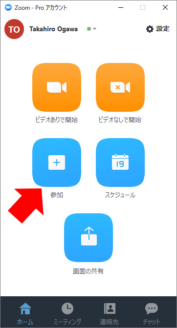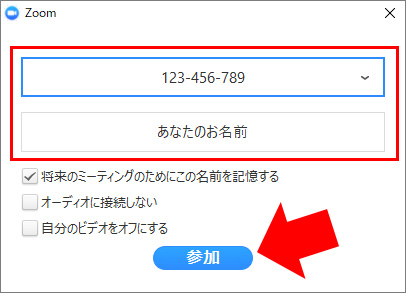 「参加」ボタンをクリックして、ミーティングIDとZoomミーティングのときに表示される名前を入力してミーティングに参加します。