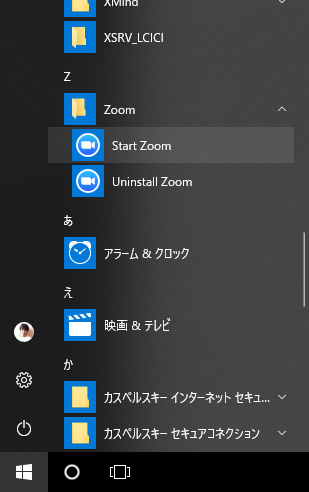 Windowsを使っている場合は、左下のスタートボタンから、Zoomを探します。