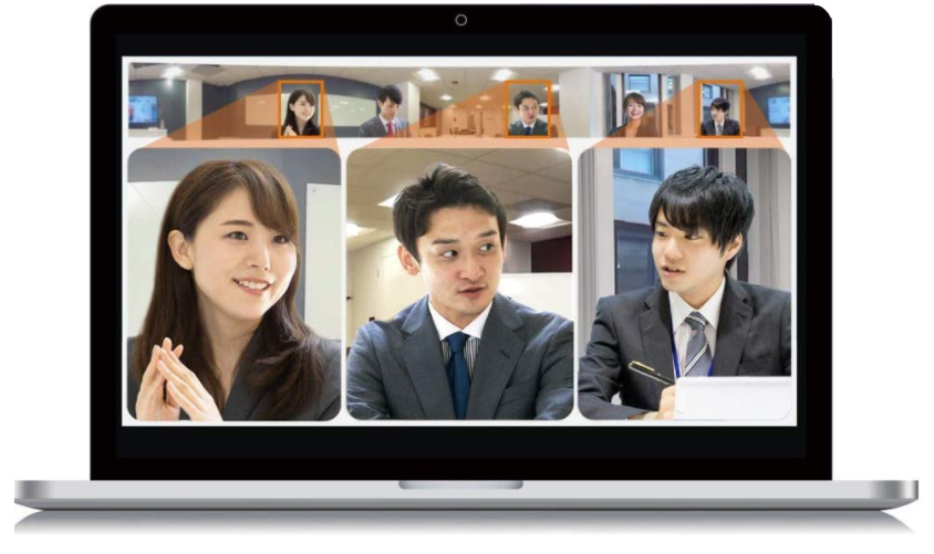 下の写真は、Amazonの商品紹介に使われていたものですが、映像の上の部分には360°の映像が映り、下の部分には、声を出した人が自動フォーカスされて映るようです。