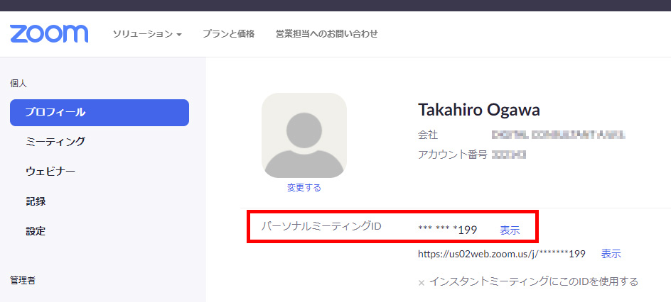 表示」をクリックするとパーソナルミーティングIDを確認することができます。