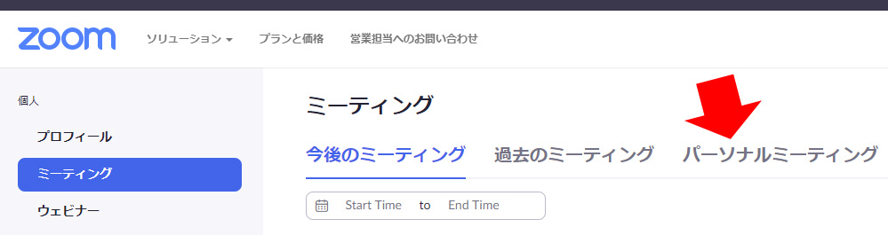WEBポータルでパーソナルミーティングIDを設定するには、「ミーティング」から「パーソナルミーティング」をクリックします。