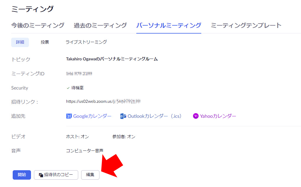 また、「編集」から、パーソナルミーティングIDを変更することもできます。