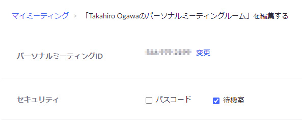 ここで、パーソナルミーティングIDを使う時に、パスコードを使うかどうか、待機室を使うかどうか、また、その他の設定を行います。