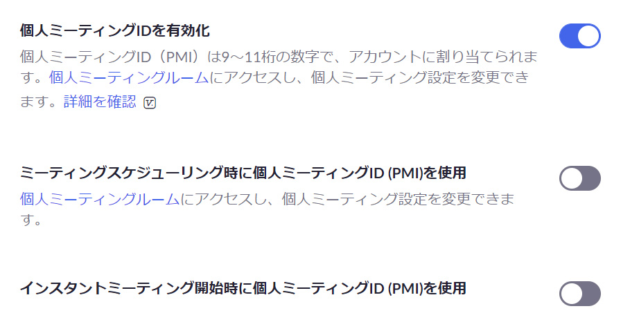 ZoomのWEBポータルやデスクトップクライアントでは、「パーソナルミーティングID」「個人ミーティングID」「PMI」と3通りの呼び方がありますが、これらはすべて同じです。