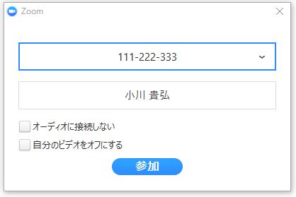 参加ボタンから入室しようとすると、ミーティングIDと表示名を聞かれますので、ここで名前を設定できます。