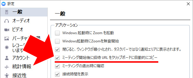 ここで、「ミーティング開始後に招待URLをクリップボードに自動的にコピー」にチェックを入れます。