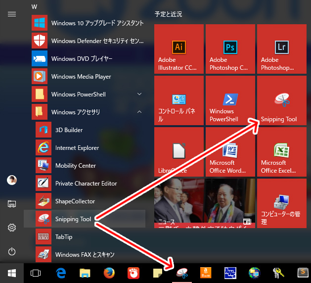 スタートボタンから、Windowsアクセサリの下にある、「Snipping Tool」を選択します。