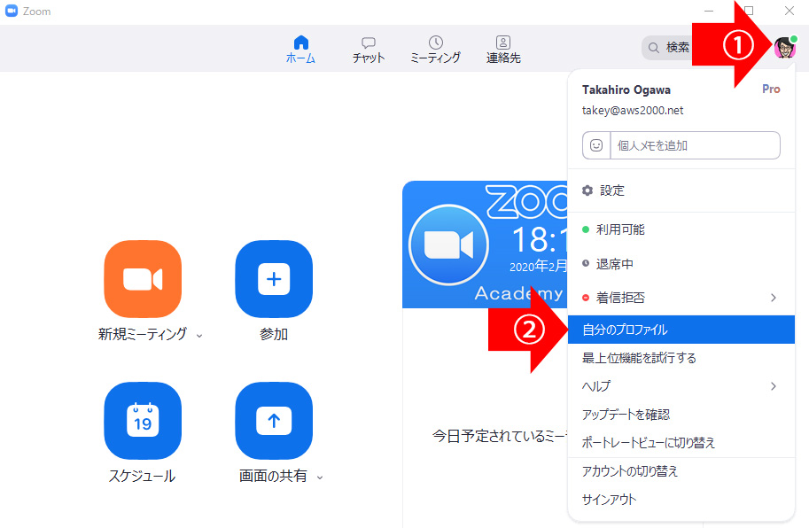 Zoomアプリから変更する場合は、右上のアイコンをクリック ⇒「自分のプロファイル」をクリック