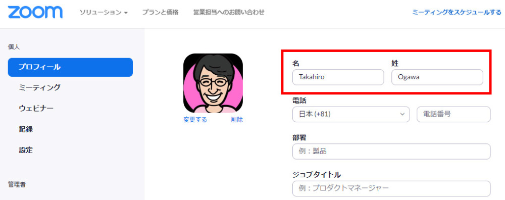 名前を元から変更するのは、zoom.us のプロフィールから行います。