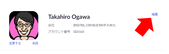 zoom.us のプロフィール画面に入りますので、名前の右の方にある「編集」をクリック。