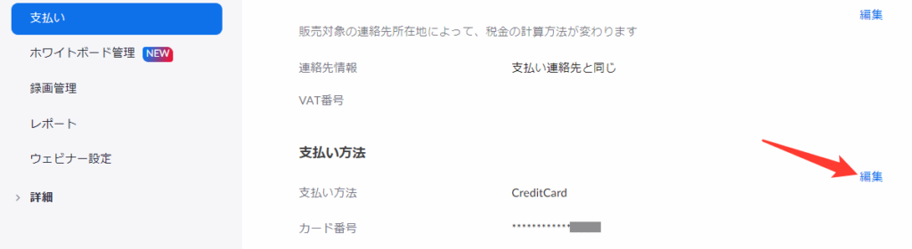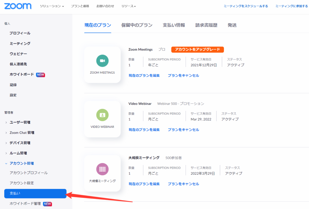まず、ZoomのWEBポータルにアクセスして、サインインをした状態で、マイアカウントに入り、「管理者」の下にある「支払い」をクリックします。