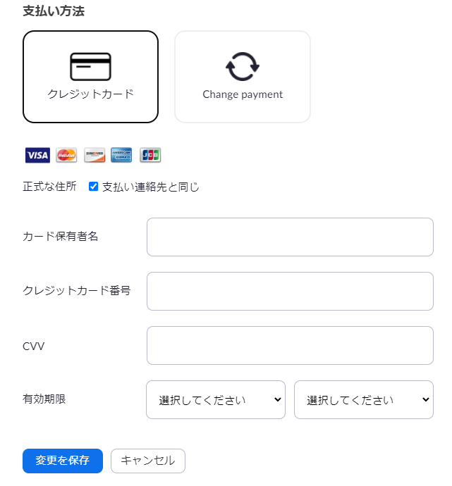新しいクレジットカードの情報を入力し、「変更を保存」をクリックすれば、クレジットカードが変更できます。