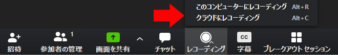 Zoomの画面で、ホストが「レコーディング」をクリックすると、有料アカウントを使用している場合は、以下の2つの選択肢に分かれます。