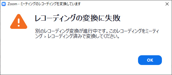 ところが、データの生成が終わる前に、次のミーティングを開き、そこでもレコーディングをした後に、ミーティングを終了すると、前のデータ生成が終わっていないため、次の動画データの生成に失敗します。