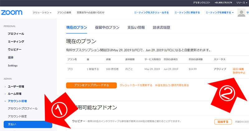 マイアカウントに入って、左の列から、「支払い」をクリックし、「登録を中止」をクリックします。