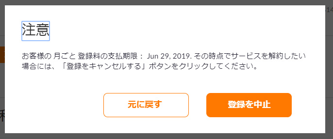 このウィンドーが表示されたら「登録を中止」をクリックすると、無料アカウントに戻ります。