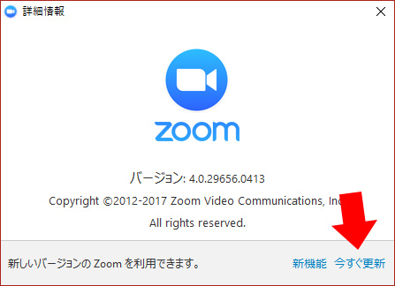 アップデートがあれば、「新しいバージョンのZoomを利用できます。」と表示されます。
