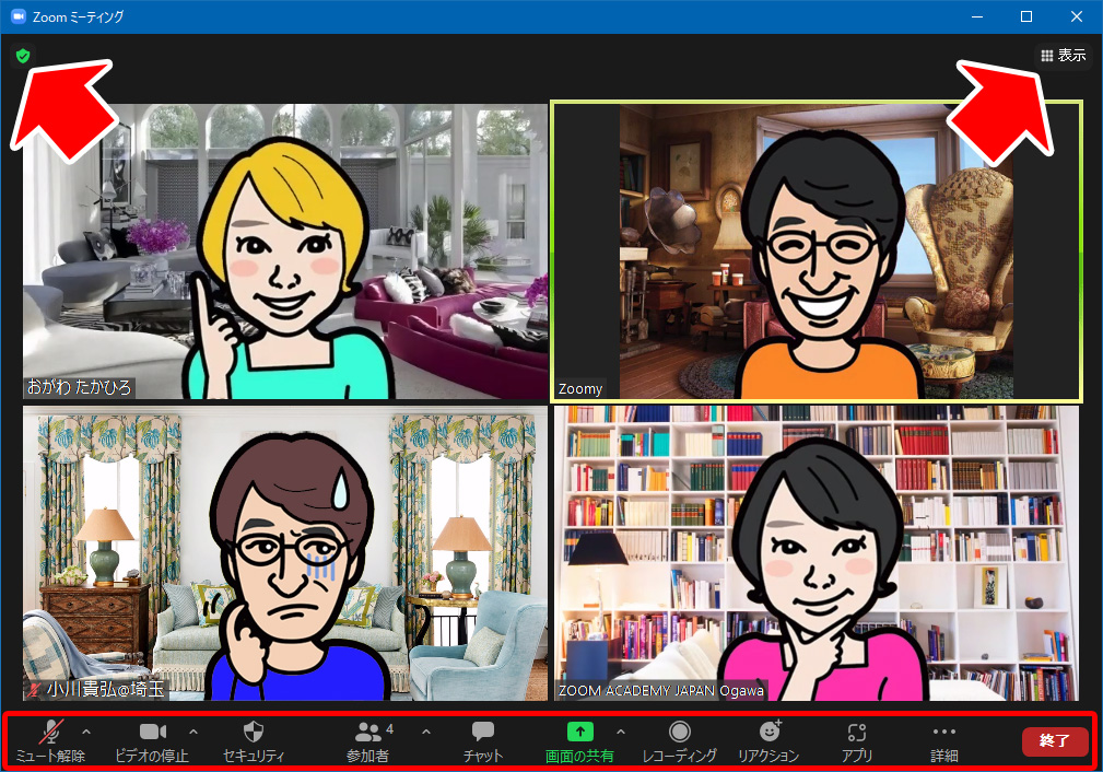ウィンドーの下に並ぶアイコンたち、そして、右上には「表示」ボタン、左上には、ミーティング情報のボタンです。