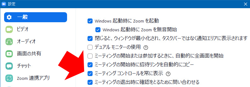 Zoomのデスクトップクライアントで、設定画面の「一般」を表示すると、「ミーティングコントロールを常に表示」というチェックボックスがあり、デフォルトではここにチェックが付いていない状態です。