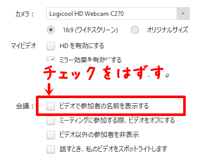 2.「ビデオで参加者の名前を表示する」のチェックをはずす