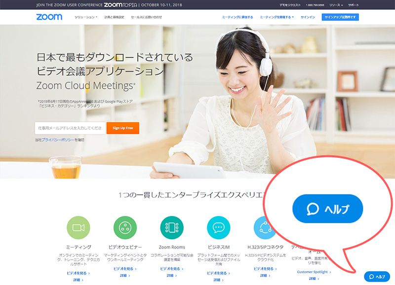 Zoom.US にアクセスをすると、右下に「ヘルプ」が表示されますので、これをクリック。