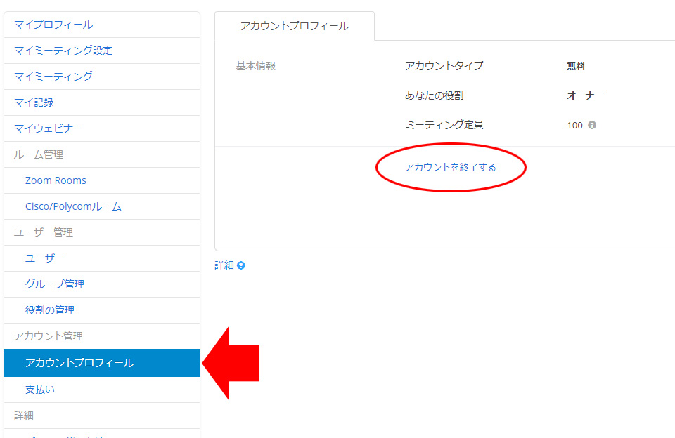 すると、「アカウントを終了する」という表示が出ますので、これをクリックすれば、アカウントを削除できます。