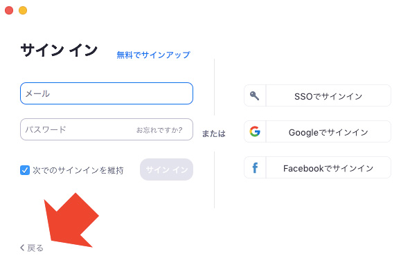 アカウントを持っていない場合は、「戻る」をクリックすれば、上の「ミーティングに参加」の画面に戻ります。