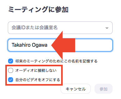 参加する時に使用する名前を入力できますので、ここで、名前を自由に決めることができます。