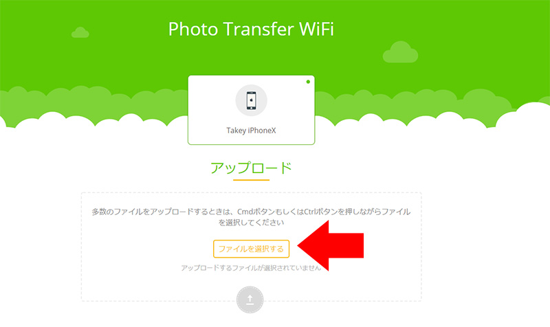 「アップロード」のところで、「ファイルを選択する」をクリックして、パソコンからiPhoneに転送したいファイルを選択します。