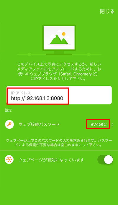 次にパソコンのWEBブラウザを起動し、アドレスバーに、上のアプリに表示されているIPアドレスを入力します。
