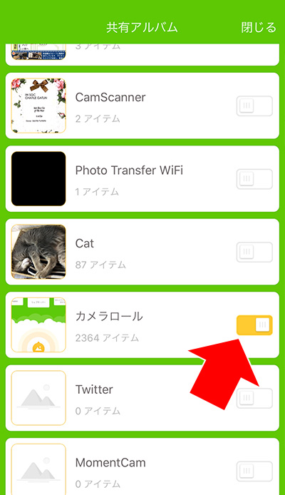ここで、転送したい写真が入れられているアルバムのスイッチをONにします。