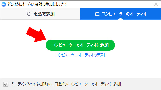 下図のようなウィンドーが表示されますので、「コンピューターでオーディオに参加」をクリックします。