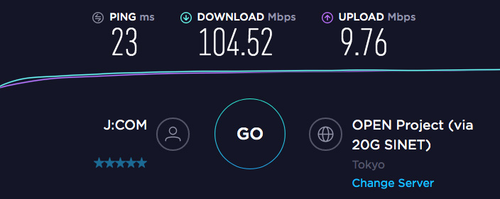 ダウンロードは、104.52Mbpsと充分な速度ですが、アップロードの速度が、9.76Mbpsです。