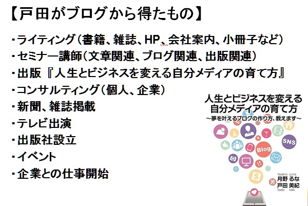 戸田さんは、2017年4月には、月野るなさんとの2冊目の共著「人生とビジネスを変える自分メディアの育て方」がamazonキャンペーン総合4位という、すばらしい成果をあげられました。