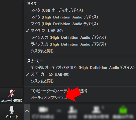 そんな時には、ミュートボタンの右にある「^」をクリックし、一番下にある「オーディオオプション…」をクリックすると、電話をマイクとして使うことができます。