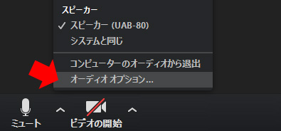 Zoomでミーティングを開始したあとであれば、「ミュート」の右側にある「^」からオーディオ オプションをクリック。