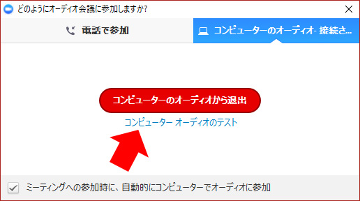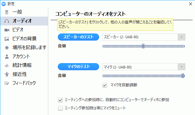 Zoomを初めて使うときには、ここで音声とマイクのテストをしましょう。