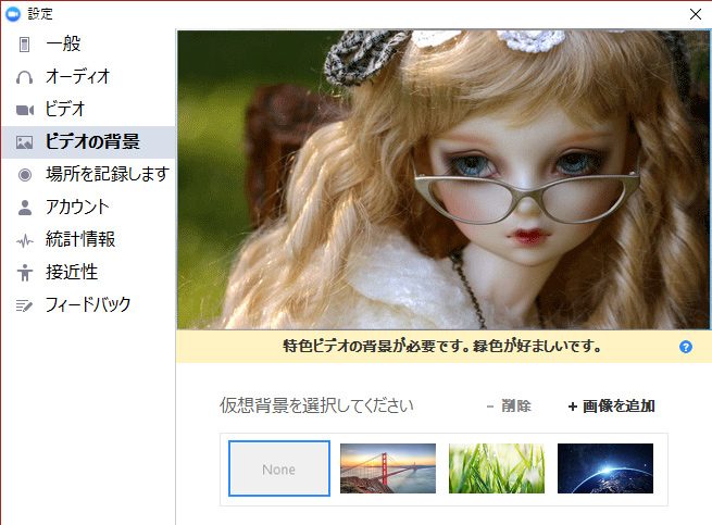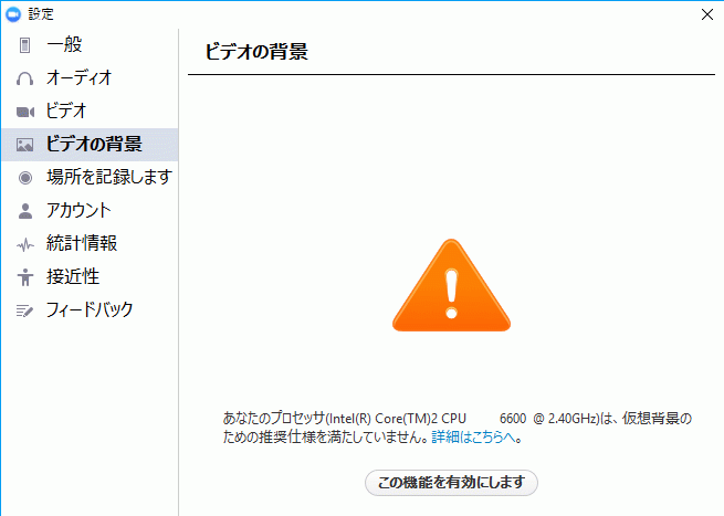 「仮装背景のための推奨仕様を満たしていません。」と出ていても、「この機能を有効にします」をクリックすれば、背景を変えても問題なく動作する場合もあります。
