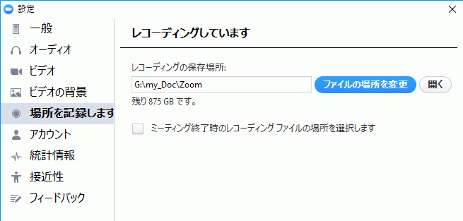 「ミーティングの終了時のレコーディングファイルの場所を選択します」にチェックを入れておけば、その都度、選択することも可能です。