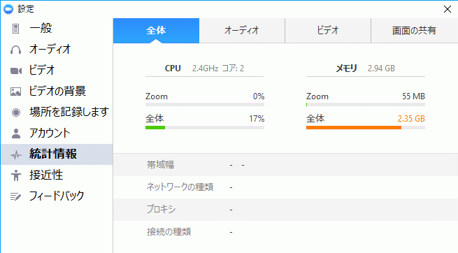 Zoomが、パソコンのリソースをどれくらい使用しているのかを見ることができます。