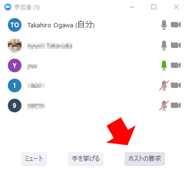 こんなときに、ホストしか使えない機能を使いたい場合は、「参加者」ボタンをクリックして、参加者の一覧を表示するウィンドーで「ホストの要求」ボタンをクリックします。