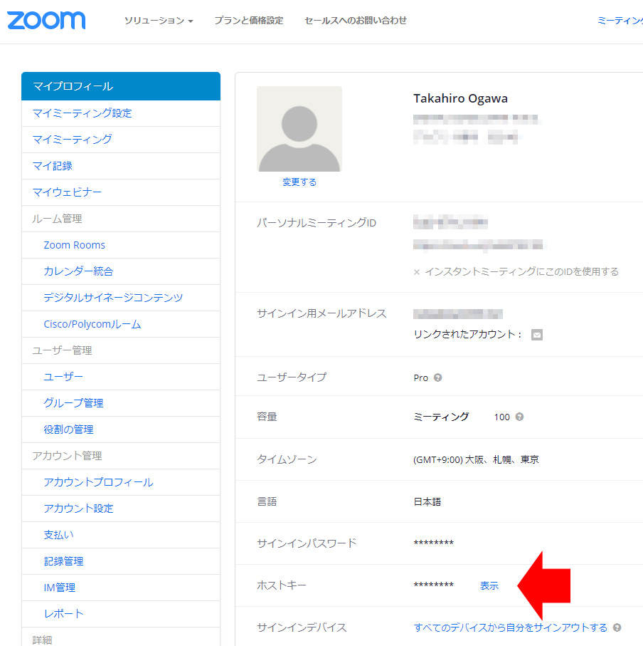 ホストキーは、アカウントの所有者が、「マイプロフィール」のページから見ることができます。