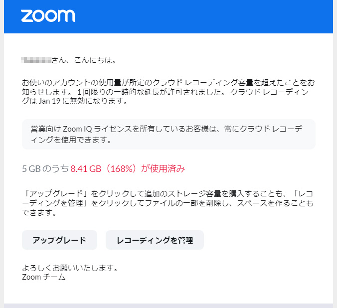 Zoomのクラウド上に 5GB以上の録画データが残っていると、容量がいっぱいなので、クラウド上の録画データを削除するか、容量を購入するようにという警告が、メールで送られてきます。