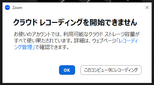 Zoomの動きとしては、レコーディングボタンをクリックして、「クラウドにレコーディング」を選択した時点で、Zoomのシステムが、クラウドのレコーディング容量を確認して、そこに、5GB以上のデータが有れば、レコーディング不可、そうでないなら、レコーディングを開始します。