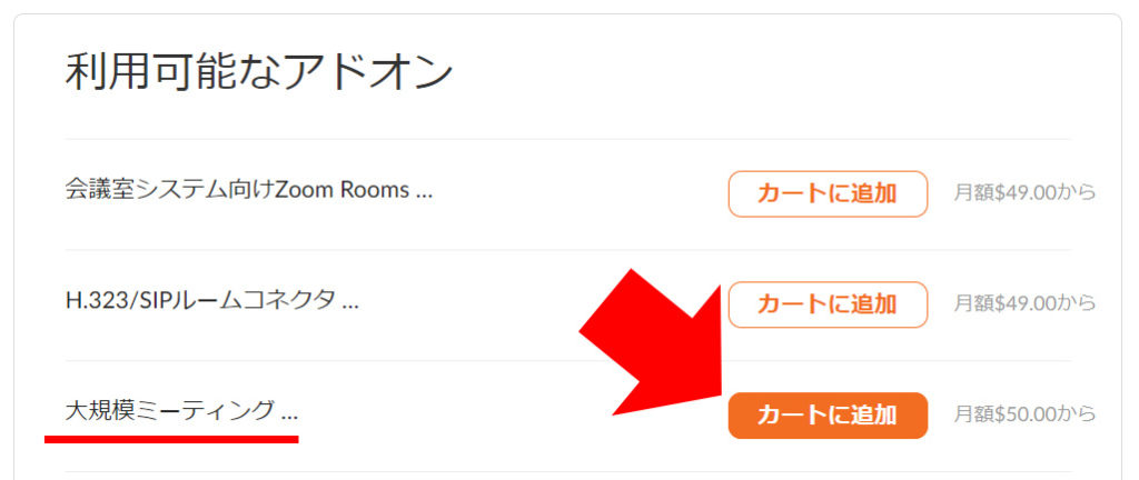 画面の下の方にある「利用可能なアドオン」の中にある「大規模ミーティング」の右側にある「カートに追加」をクリック。
