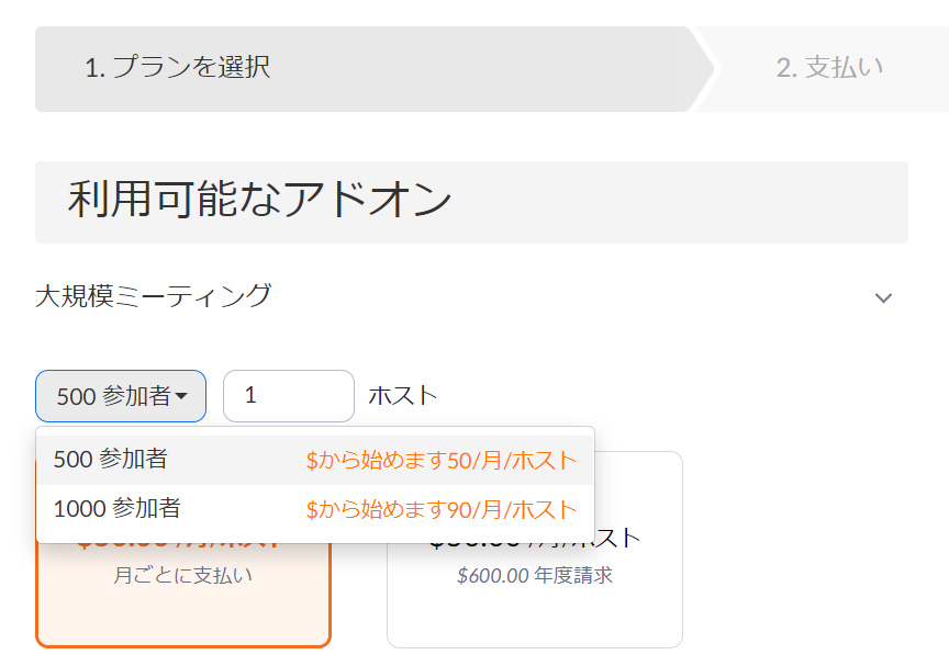 また、大規模ミーティングを使うかどうかは、支払いサイクルの間で、一ヶ月単位で使う、使わないを切り替えることもできます。
