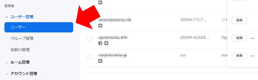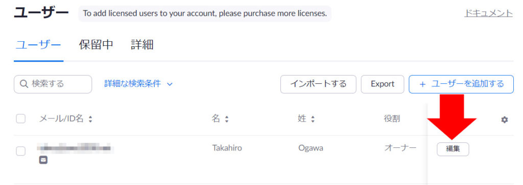 大規模ミーティングを使用したいユーザーの右側にある「編集」をクリック。