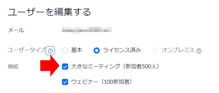 ここで、ライセンス済み」になっていることを確認し、「大きなミーティング」にチェックを付けて「保存」をクリックしてください。