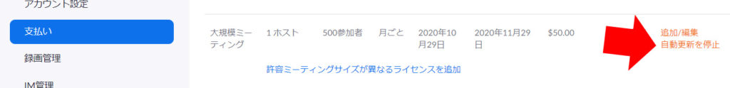 「支払い」から、「自動更新を停止」で、大規模ミーティングの次月からの支払いを停止できます。