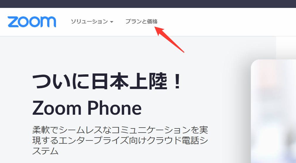 まず、ZoomのWEBポータルで「プランと価格」をクリックします。